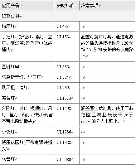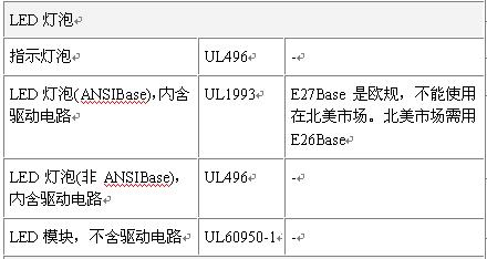 以下首先針對LED燈具、LED燈泡及LED驅(qū)動器等三種基本產(chǎn)品分類,及其分別沿用至各成品或零件時,所應參考的UL安規(guī)標準及應特別注意事項,以做為業(yè)者欲進行產(chǎn)品安規(guī)檢測的基本指南。不過該表僅供讀者參考,產(chǎn)品實際的歸類,仍須依產(chǎn)品的用途及其使用環(huán)境來決定。