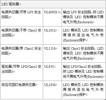 4.其它要求:如LED電源、LED數(shù)組、LED模塊及LED控制模塊等安全及外殼要求等。LED的電源可以是下列標準所驗證的電源供應器,包括UL1012,UL1310及UL60950-1。基本上,LED數(shù)組、LED模塊及LED控制模塊只要位于LPS/Class2安全回路上,就沒有任何電氣外殼的要求。LED燈具對于電源輸出方式的規(guī)定為基本絕緣,與完全沒有隔離是一樣的。對于LED數(shù)組、LED模塊及LED控制模塊,如果使用的電源不用大到超過LPS/Class2,建議最好要符合LPS/Class2。反之,若使用的能量將大于LPS/Class2,則有沒有提供隔離一次側(cè)與二次側(cè)電源電路的絕緣,對塑料外殼的要求上,是沒有差別的。