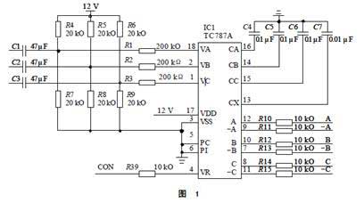 從同步變壓器來的三相過零信號經(jīng)C1、C2、C3電容耦合到6V的直流信號上送入18、2、1腳。TC787對其進(jìn)行過零檢測,經(jīng)積分電容C4、C5、C6形成以過零點為起點的三角波,與由VR引入的觸發(fā)控制信號比較,再經(jīng)C7調(diào)制成觸發(fā)脈沖,由12、9、10、7、8、11腳輸出,由脈沖變壓器驅(qū)動可控硅。