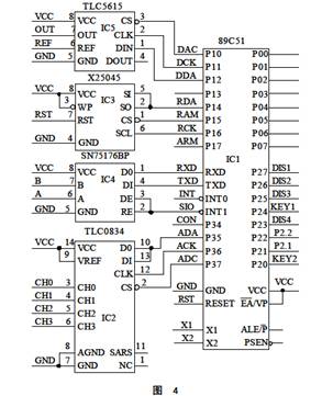 TLC0834是4路8位A/D轉(zhuǎn)換器,采集1路電壓和3路電流信號;TLC5615是10位串行D/A,將控制量變?yōu)槟M電壓信號,去控制可控硅交流調(diào)壓;X25045是含WDT和EEPROM的多功能電路,負(fù)責(zé)單片機系統(tǒng)的安全監(jiān)視和重要參數(shù)的保護(hù);SN75176是RS485接口,實現(xiàn)連網(wǎng)監(jiān)控。