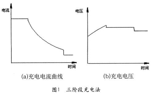 三階段充電法是兩階段等流充電法和恒定等壓充電法相結合的方式。充電開始和結束時采用恒定電流,中間階段為恒定電壓充電。蓄電池在充電初期用較大的電流,經(jīng)過一段時間改為恒定電壓充電,當電流衰減到預定值時,由第二階段轉到第三階段。采用三階段充電法的優(yōu)點是:避免了恒定電壓充電法開始充電電流過大,而后期電流又過小的情況,比二階段等流充電在中間階段更接近充電電流接受率曲線。這種充電法減少了充電出氣量,充電又徹底,延長了蓄電池使用壽命。三階段充電法充電電流和充電電壓變化曲線如圖1所示。[page]