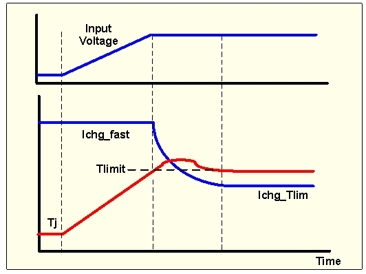 為解決此類散熱問(wèn)題,可添加一個(gè)散熱環(huán)路,以降低充電電流并確保IC結(jié)點(diǎn)溫度低于熱關(guān)斷閾值。為bq2406X系列線性充電器添加了散熱環(huán)路的運(yùn)行如圖2所示。散熱環(huán)路在激活狀態(tài)下可有效降低充電電流,降低充電器級(jí)功率MOSFET的功耗。