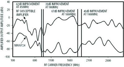 圖6Maxim公司的耳機(jī)驅(qū)動(dòng)器MAX9724極大提升了抗射頻解調(diào)能力