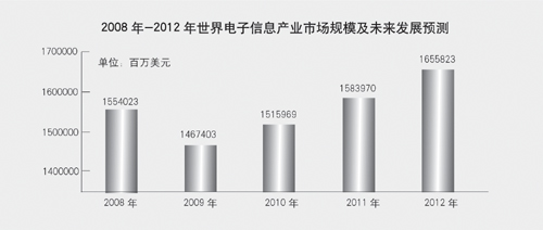2010年,全球電子信息產(chǎn)業(yè)將逐步回暖并步入全面復(fù)蘇階段。根據(jù)《世界電子數(shù)據(jù)年鑒》預(yù)測,未來3年,全球電子信息產(chǎn)業(yè)市場規(guī)模將維持3%-4%的增幅,預(yù)計(jì)2010年市場規(guī)模將達(dá)到15159.7億美元,2012年將達(dá)到16558.2億美元。同時,未來3年信息技術(shù)應(yīng)用將進(jìn)一步深化,信息技術(shù)的廣泛滲透和深度應(yīng)用將催生出一批新的增長點(diǎn);綠色I(xiàn)T將成為未來發(fā)展重點(diǎn),綠色信息技術(shù)在節(jié)能減排、低碳經(jīng)濟(jì)中將發(fā)揮重要作用;企業(yè)并購重組步伐加快,新興市場拓展將成為電子信息產(chǎn)業(yè)發(fā)展的另一個重要引擎。