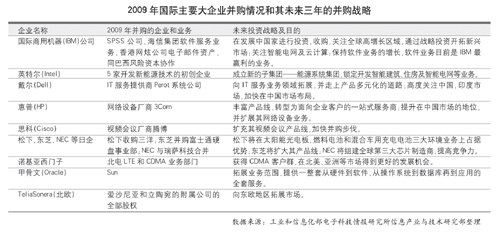 2009年,世界主要IT企業(yè)為應(yīng)對國際金融危機(jī),紛紛通過并購戰(zhàn)略整合優(yōu)勢資源,開拓新興市場,實(shí)施產(chǎn)品多元化發(fā)展,從而提升行業(yè)戰(zhàn)略地位和自身的競爭力。未來3年這種發(fā)展態(tài)勢仍會繼續(xù)。