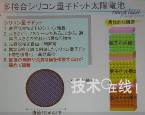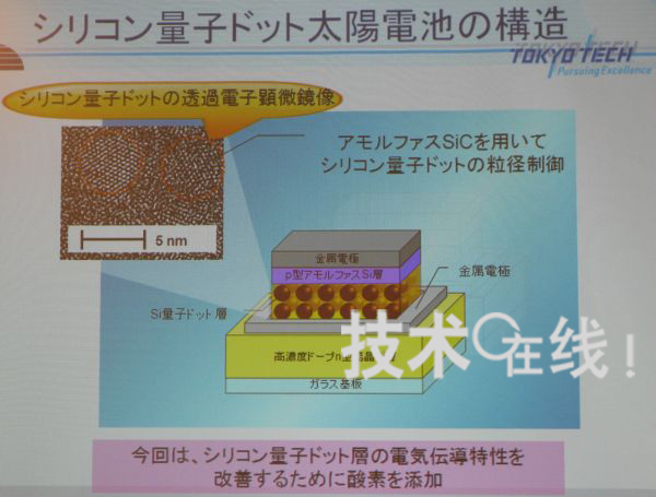 東京工業(yè)大學教授小長井誠研究小組,大幅提高了利用硅量子點的太陽能電池的開放電壓(Voc)及I-V特性形狀因子(FF)數(shù)值。2010年3月10日,該消息是在應(yīng)用物理學會舉行的2010年春季應(yīng)用物理學會學術(shù)演講會的會前新聞發(fā)布會上宣布的。