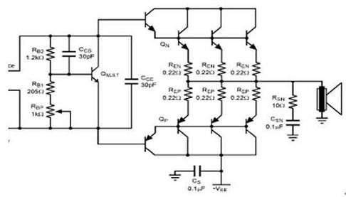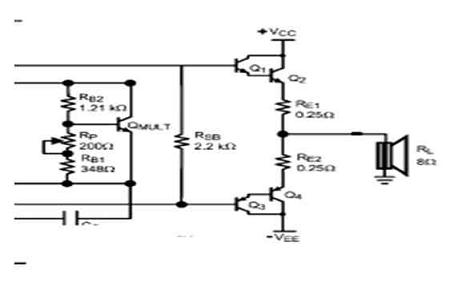 改善交越失真的最有效方法便是減少RE的電阻。對于相同數(shù)值的RE,一個平行形式的輸出可降低用來改善線性度的整體RE電阻值。同時,假如每一個級的RE都較大,那便可為輸出晶體管帶來更佳的匹配性和電流平衡。此外,RE也關系到輸出的功率損耗。對于一個相同的RE,較大的輸出電流會導致較大的功率損耗。RE的值取決于并聯(lián)輸出晶體管的數(shù)量和揚聲器的負載。建議采用足夠功率的0.1到0.5Ω電阻器。