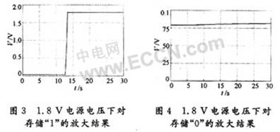 圖4為靈敏放大器在1.8V電源電壓在室溫條件下對存儲信息“0”放大的仿真圖形。從仿真結(jié)果可以看出,輸出電壓有微小的變化,但是在整個過程中輸出電壓都低于0.1V,都在低電平范圍內(nèi)。這說明該電流靈敏放大器在室溫情況下能對存儲信息“0”進(jìn)行可靠讀取。