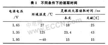 表1是該電流靈敏放大器在不同電源電壓和環(huán)境溫度下的讀取時(shí)間。從表1中可以看出在較低電源電壓和惡劣環(huán)境下該電流靈敏放大器仍然有比較好的性能。表1還把本文的電流靈敏放大器的仿真結(jié)果與參考文獻(xiàn)[6]所仿真的結(jié)果進(jìn)行了對比,可以看出在本文所設(shè)計(jì)的電流靈敏放大器在某些情況下有更快的讀取速度。