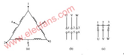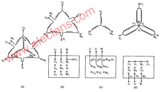 其中,(a)圖為結(jié)構示意圖,改變接線方法可獲得兩種接法,(b)圖為三角形接法,磁極對數(shù)為2對極,同步轉(zhuǎn)速為1500r/min,是一種低速接法;(c)圖為雙星形接法,磁極對數(shù)為1對極,同步轉(zhuǎn)速為3000r/min,是一種高速接法。