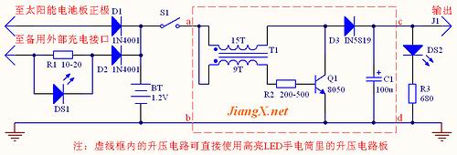 太陽能供電板的電路如圖1所示。由D1、BT構(gòu)成系統(tǒng)的太陽能充電電路。平時,只要達到一定光強,太陽能電池板便通過二極管D1為充電電池BT充電,直至飽和。除了太陽能充電方式外,我還設(shè)計了備用的外部直流電源充電接口以防不時之需。外部充電電路由R1、DS1、D2、BT構(gòu)成,R1選用功率為1W的電阻,當(dāng)R1為10歐姆的時候,最佳外部充電電壓為3-4伏,DS1為外部充電指示燈,它是利用電阻R1上的壓降來點亮的。后面的升壓電路是運用間歇振蕩器的快速關(guān)斷(截止)的特性而實現(xiàn)升壓的。S1為供電開關(guān),當(dāng)S1閉合后升壓電路開始工作,太陽能供電板便可驅(qū)動負載,J1為輸出接口,DS2是輸出指示燈。