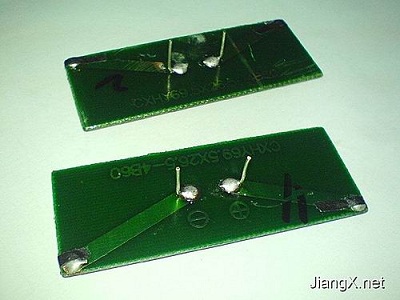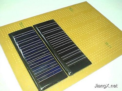 首先剪一小段金屬絲焊接在太陽能電池板的兩個電極上作為引腳(圖3),以便于連接和固定在電路板上。兩塊太陽能電池板是正極對正極,負極對負極(上面有標(biāo)識)并聯(lián)起來使用的,這樣可以有效地增強太陽能電池板提供電流的能力。安裝好太陽能電池板后如圖4所示。