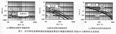 在音頻電路中經(jīng)常采用陶瓷電容器作為交流耦合元件,在低頻提升和濾波電路中也大量使用。圖2(C)所示測試曲線類似于圖2(b),所不同的只是采用了表2給出的三種陶瓷電容器做測試。