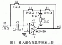 圖3所示音頻放大器采用了一種新穎的交流耦合方式,它與傳統(tǒng)的耦合電路配置相比只需要非常小的耦合電容器。圖中輸入電容器(C1)的容量僅為0.047μF。因此,我們可以采用電壓系數(shù)非常低的COG/1206陶瓷電容器這樣可以最大限度地降低電壓系數(shù)的影響。運(yùn)算放大器(必須采用低偏置電流的放大器,例如MAX4490型)的直流反饋由兩個100kΩ的電阻器(R3和R4)組成,C2和R5用來衰減直流反饋環(huán)路的音頻頻率。主要音頻反饋元件為R1、R2和C1三個無源元件。根據(jù)圖中所示的元件值,該電路的-3db截止頻率設(shè)置在5Hz。