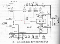 圖5所示MAX4410典型的立體聲耳機(jī)放大器應(yīng)用電路。設(shè)置輸入電容Cin等于10μF時能夠?qū)㈦娙萜麟妷合禂?shù)的影響限制到亞音頻頻率,該電路省略了大容量的輸出耦合電容器。