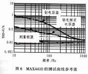 關(guān)于大容量電容器,圖6給出兩種100μF電容器和16電阻器組成的無源高通濾波器的THD+N與頻率的關(guān)系曲線。在100Hz、-3db截止頻率,兩種電容器的電壓系數(shù)均會導(dǎo)致THD指標(biāo)惡化。100μF的鉭電容器在-3db截止頻點(diǎn)THD+N指標(biāo)為0.2%。如果采用Maxim專有的DirectDrive放大器,因為省略了這個大容易輸出耦合電容器,可大大改進(jìn)低頻和音頻質(zhì)量。在圖6所示曲線中,MAX4410測試曲線近似等于參考值。