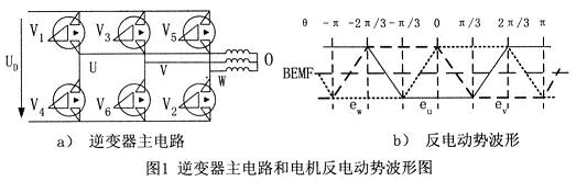 實(shí)現(xiàn)無(wú)刷直流電機(jī)電子換相及PWM控制的逆變器主電路如圖1a所示。采用兩兩通電方式,即每一個(gè)瞬間有兩個(gè)功率管導(dǎo)通,每隔60°電角度換相1次,每一功率管導(dǎo)通120°電角度。功率管的導(dǎo)通順序是:V6V1→V1V2→V2V3→V3V4→V4V5→V5V6。