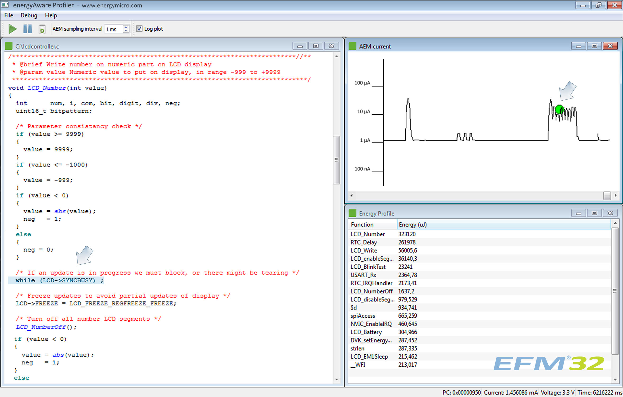 energyAware Profiler是用于PC的一種能量調(diào)試工具,它采用了現(xiàn)有的EFM32 Gecko開發(fā)工具包中的專用Advanced Energy Monitoring (先進(jìn)能源監(jiān)控AEM)系統(tǒng)。AEM能顯示開發(fā)工具包里印刷線路板上液晶顯示器應(yīng)用的實(shí)時(shí)耗電量,如圖3所示,在運(yùn)用Profiler軟件時(shí),能源調(diào)試的真正能量才得以實(shí)現(xiàn)。