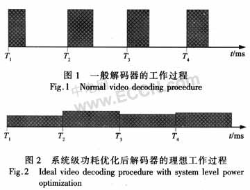 式中:T為工作時間;C是與系統負載電容相關的系數;Vdd和f分別為供電電壓和運行頻率。對于同樣的負載,根據式(1),很容易推導出,當負載均勻分布于時間間隔T內時,能量效率是最優(yōu)的。所以,對于面向多媒體應用的SOC低功耗系統級優(yōu)化而言,其主要思想就是如何根據具體應用的需要,在當前可用的IP及其配置中,尋求一套最優(yōu)化的組合,使得系統負載能均勻分布在給定的時間約束內。圖2給出的則是設計者進行系統級功耗優(yōu)化的理想狀態(tài),雖然在實際應用中該狀態(tài)永遠無法達到,但是可以在設計過程中無限逼近這一狀態(tài)。