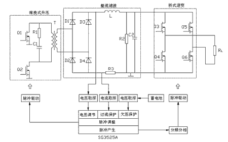 本逆變器輸入端為汽車蓄電池(+12V,4.5Ah),輸出端為工頻方波電壓(50Hz,220V)。其系統(tǒng)主電路和控制電路框圖如圖1所示,采用了典型的二級變換,即DC/DC變換和DC/AC逆變。12V直流電壓通過推挽式變換逆變?yōu)楦哳l方波,經(jīng)高頻升壓變壓器升壓,再整流濾波得到一個穩(wěn)定的約320V直流電壓;然后再由橋式變換以方波逆變的方式,將穩(wěn)定的直流電壓逆變成有效值稍大于220V的方波電壓,以驅(qū)動負(fù)載。為保證系統(tǒng)的可靠運行,分別采集了DC高壓側(cè)電壓信號、電流信號及蓄電池電壓信號,送入SG3525A,通過調(diào)整驅(qū)動脈沖的占空比或關(guān)斷脈沖來實現(xiàn)電壓調(diào)節(jié)、過流保護(hù)及欠壓保護(hù)等功能。