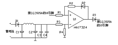 如圖5所示,D1為蓄電池極性反接保護(hù)。SG3525A的引腳16輸出參考電壓5V,取R3=R4=10kΩ。在正常情況下,U1的反相輸入端電壓大于正向輸入端電壓,U1輸出低電平,二極管D1、D2截止。當(dāng)蓄電池電壓低于10V時,比較器U1開始工作,輸出由低電平變?yōu)楦唠娖?,D2、D3導(dǎo)通,并把同相輸入端電位提升為高電平,使得U1一直穩(wěn)定輸出高電平,向SG3525A的引腳10輸出關(guān)斷信號。