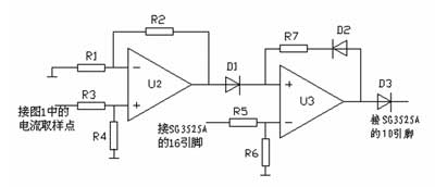 如圖6所示,運放U2及外圍電阻構(gòu)成反比例放大器,運放U3及外圍電路構(gòu)成比較器。圖1中的R3為取樣電阻,取2.2Ω,2W。當(dāng)負(fù)載電流增大時,該電阻的壓降△U增大。