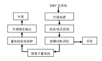 從手機(jī)鋰離子二次電池的恒流/恒壓充電控制出發(fā),用220V交流電通過配置的內(nèi)置儲能鋰電池對手機(jī)鋰離子電池充電。電路的具體工作流程如圖1所示。