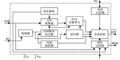 首先,由振蕩器和內(nèi)部振蕩器共同作用到時鐘脈沖發(fā)生器,產(chǎn)生時鐘信號,用來控制D/A轉(zhuǎn)換、-ΔV運算器及其他有關(guān)單元電路,并使之同步工作。該充電芯片在中斷充電電流期間進(jìn)行采樣,以求采樣的精確。采樣電壓從腳4(BAT)進(jìn)入電路內(nèi)部,經(jīng)A/D轉(zhuǎn)換后送入-ΔV運算器處理,并將運算結(jié)果送入充電控制單元,隨時控制充電過程。
