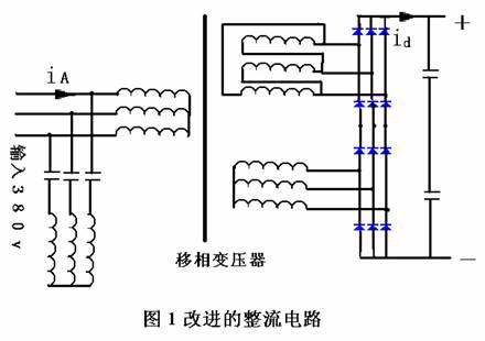 采用如圖1所示的12脈波整流電路,移相30°構成串聯(lián)2重結電路,利用變壓器二次繞組接法的不同,使兩組三相交流電源間相位錯開30°,從而使整流輸出電壓在每個交流電源周期中脈動12次,故為12脈波整流電路。變壓器二次繞組分別采用星形和三角形接法構成相位角相差30°、大小相等的兩組電壓,接到相互連接的整流橋上。