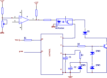 比較器A的第二腳接變壓器原邊電流轉換的電壓值,O1為快速光電耦合器HCPL4504,其輸出三極管與快恢復二極管相串聯(lián),當變壓器原邊電流沒有超過設定的閾值時,無集中過流信號,此時光耦的輸入側二極管處于導通狀態(tài),在分散過流檢測通道中串入的光耦不會影響分散過流保護功能,當變壓器原邊電流超過設定的閾值時,產(chǎn)生集中過流信號,此時光耦的輸入側二極管迅速關斷,快速光耦的輸出側三極管迅速關斷,M57962的1腳將懸空,此時IGBT如果仍處于導通狀態(tài),則驅動模塊內部的過流保護電路就會動作,對IGBT實施軟關斷保護。這樣,不論分散過流保護,還是集中過流保護,都能對IGBT實施軟關斷保護,防止過大的關斷電壓對IGBT造成損壞。