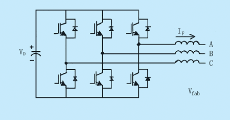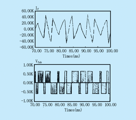 帶自控直流母線(xiàn)的并聯(lián)APF,有一類(lèi)似于靜態(tài)補(bǔ)償器(STATCOM)的拓?fù)?,STATCOM是用于電力系統(tǒng)中補(bǔ)償無(wú)功功率的。并聯(lián)的APF,以注入相等而反向的諧波電流對(duì)負(fù)荷電流的諧波進(jìn)行補(bǔ)償。此時(shí),并聯(lián)APF是作為注入諧波分量的電流源而工作的,諧波分量由負(fù)荷產(chǎn)生,但已移相180o。圖4為并聯(lián)APF的接線(xiàn)圖,圖5表示APF補(bǔ)償?shù)墓ぷ髟?。為能輸出圖5所示濾波器電流波形的IF,需要設(shè)置圖4中的控制電路,以便產(chǎn)生圖6所示的Vfab脈寬調(diào)制電壓圖。