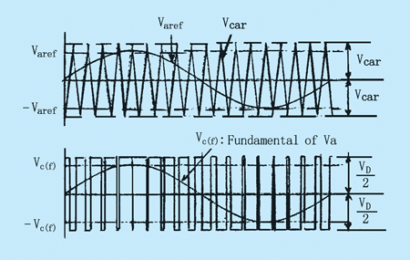 為產(chǎn)生任意波形的交流電壓,將PWM技術(shù)應(yīng)用到直流母線(xiàn)電壓斬波的電壓源逆變器上?,F(xiàn)有很多能組成正弦波或任意波形的PWM技術(shù),利用PWM技術(shù),不僅允許控制逆變器作為電壓源,也可作為電流源以控制濾波器的交流輸出。圖2為所利用的最普通的三角載波(TC)技術(shù),這是最簡(jiǎn)單的線(xiàn)性控制方法,是將有固定幅值的和固定三角波的輸出電流誤差進(jìn)行比較。迫使開(kāi)關(guān)周期內(nèi)的輸出電壓Va限定于Vcar的載波周期內(nèi),并等于調(diào)制波Varef的平均幅值。正弦調(diào)制波的合成電壓含正弦基波分量Va(f)和不希望的諧波分量,利用盡可能高的頻率載波,可使這些不想要的諧波成分減到最小,但這取決于半導(dǎo)體功率器件(IGBT、GTO或IGCT)的最大開(kāi)關(guān)頻率。