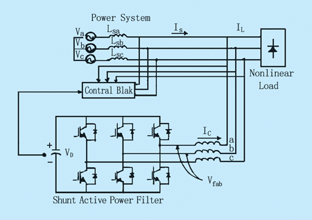 APF是抑制電網(wǎng)諧波和補(bǔ)償無(wú)功功率、改善電網(wǎng)供電質(zhì)量的最有效PE裝置。大多數(shù)APF拓?fù)渚秒妷涸茨孀兤?,并通常以電容器作為貯能器件如圖1所示。以適當(dāng)選通可控的功率半導(dǎo)體開(kāi)關(guān),把直流電壓變換成交流電壓。雖然,為合成交流電壓能施加每半周的單脈沖,但對(duì)大部分應(yīng)用中要求的動(dòng)態(tài)性能,今天普遍采用的是脈寬調(diào)制(PWM)。