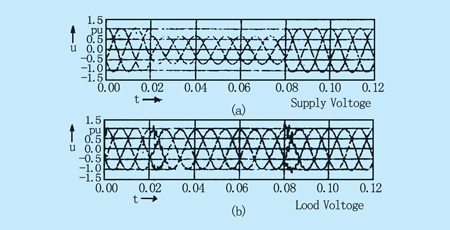 如圖7所示,無(wú)源LC濾波器與負(fù)荷并聯(lián),串聯(lián)型APF的工作如同一臺(tái)諧波隔離器,迫使負(fù)荷電流諧波主要通過(guò)無(wú)源濾波器循環(huán),而不經(jīng)過(guò)配電系統(tǒng)。此方案的優(yōu)點(diǎn)是:串聯(lián)APF的額定功率僅為負(fù)荷定額(KVA)的一小部分,通常為5%。但在電壓補(bǔ)償時(shí),串聯(lián)APF的視在功率定額可能增加。圖8是串聯(lián)濾波器為補(bǔ)償負(fù)荷側(cè)電壓諧波的工作原理圖。串聯(lián)APF還可用于抗基波電壓的干擾。圖9所示為電源電壓偶然跌落時(shí)串聯(lián)APF所起的作用。如圖8所示,負(fù)荷電壓幾乎保持恒定,僅在電源電壓跌落的起始和最后瞬間,出現(xiàn)了很小的不穩(wěn)定和振蕩。