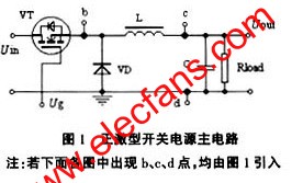 一般來講,正激型開關(guān)電源主電路可用圖1所示的降壓斬波器簡(jiǎn)化表示,Ug表示控制電路的PWM輸出驅(qū)動(dòng)信號(hào)。根據(jù)選用不同的PWM反饋控制模式,電路中的輸入電壓Uin、輸出電壓Uout、開關(guān)器件電流(由b點(diǎn)引出)、電感電流(由c點(diǎn)引出或d點(diǎn)引出)均可作為取樣控制信號(hào)。