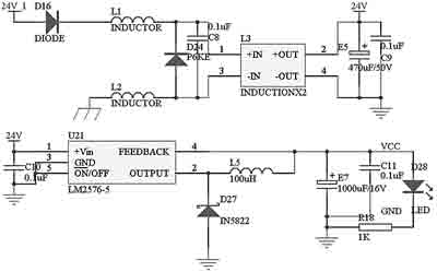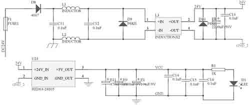 本控制模塊的電源電路如圖2所示。車載蓄電池—發(fā)電機(jī)的電源從24V_1處進(jìn)入,二極管D16主要是防止電源的正負(fù)極被誤接反。電感L1、L2對(duì)電源進(jìn)行濾波,和共模電感L3、電容C8配合,可以過(guò)濾掉電源中的尖峰脈沖。二極管D24P6KE51A是脈沖干擾抑制器(TVS),它可以快速吸收超過(guò)額定電壓的尖峰脈沖,瞬時(shí)通過(guò)電流很大,最大功率可達(dá)500~1000W。電容E5和C9進(jìn)一步對(duì)電源進(jìn)行濾波。過(guò)濾干凈的電流通過(guò)開(kāi)關(guān)電源芯片LM2576變換為系統(tǒng)使用的5V電源。電容E7和C11對(duì)輸出5V電源進(jìn)行濾波,電阻R18和發(fā)光二極管D28指示當(dāng)前是否有電。