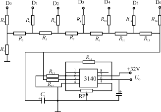 這需要將計數(shù)器的二進(jìn)制數(shù)轉(zhuǎn)化為電壓。顯然用D/A轉(zhuǎn)換是可以的,但電路復(fù)雜程度上升,成本也有所提高。故為了簡化電路我們僅借用D/A轉(zhuǎn)換網(wǎng)絡(luò)的思想,利用權(quán)電阻T形網(wǎng)絡(luò)將4516的7位數(shù)值變換成模擬量輸出,推動電壓表指示,見圖5。