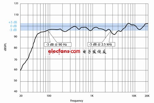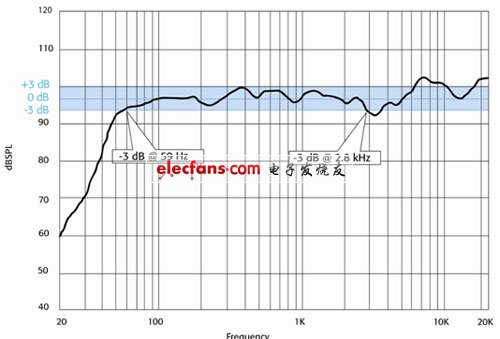 如果說+/-3dB所表示的是平坦特性,而不是頻率響應(yīng)范圍,那么這個參數(shù)對頻率特性而言還有什么意義?回答這個問題前我們可以看一下制造商在典型揚聲器說明書上所標注的“+/-3dB頻響。”