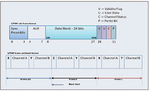 S/PDIF幀格式——首先驅動數據的最低有效位。每個幀有兩個子幀,分別是32個時隙,共64個時隙(見圖2)。子幀以一個前導碼開始,后面跟隨24位數據,最后以攜帶用戶數據和通道狀態(tài)等信息的4位結束。子幀的前4個時隙稱為前導碼,用于指示子幀和塊的開始。前導碼有三個,每一前導碼均包含一個或兩個持續(xù)時間為3UI的脈沖,從而打破雙相編碼規(guī)則。這意味著,該模式不可能存在于數據流中的其他地方。每個子幀都以4位前導碼開始。塊的開始用前導碼“Z”和子幀通道的開始“A”表示。前導碼“X”表示通道“A”子幀的開始(不同于塊的開始),前導碼“Y”表示通道“B”子幀的開始。
