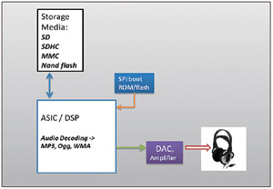 便攜式音頻系統(tǒng)——有些手持式音頻系統(tǒng)采用ASIC,有些則采用DSP。MP3、Ogg和其他媒體文件等音頻內容通常存儲在高密度存儲設備中,如NAND閃存、安全數字(SD)卡、多媒體卡(MMC)和安全數字高容量卡(SDHC)等。