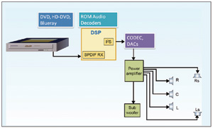 利用多聲道、多揚聲器系統(tǒng)和先進的音頻算法,音頻系統(tǒng)能夠惟妙惟肖地模擬真實聲音。這些復雜的音頻系統(tǒng)使用ASIC或DSP來解碼多聲道編碼音頻,并且運行各種后處理算法。聲道數量越多,意味著存儲器和帶寬要求越高,這就需要使用音頻數據壓縮技術來編碼并減少所要存儲的數據。這些技術還能用來保持聲音質量。