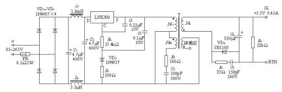 1)采用高效率恒壓/恒流式單片開關(guān)電源LNK500,交流輸入電壓范圍是85~265V,當(dāng)交流輸入電壓為265V時(shí),漏電流<5μA,額定輸出電壓為5.5V,最大輸出電流為0.45A,輸出功率為2.5W。