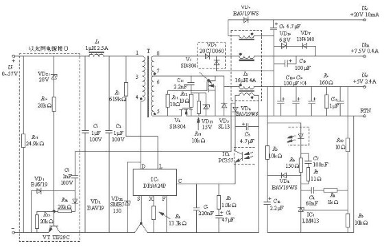 該電源以5V輸出作為主輸出,其他兩路輸出都是在此基礎(chǔ)上獲得的。由C11,R11,R12和MOS場(chǎng)效應(yīng)管V2及V1構(gòu)成5V主輸出的電容耦合式同步整流器。穩(wěn)壓管VDZ3起箝位作用。在沒有開關(guān)信號(hào)時(shí),通過下拉電阻R13使V2關(guān)斷。儲(chǔ)能電感L2回掃繞組的電壓經(jīng)過VD4和C9整流濾波后,獲得20V輸出。高頻變壓器次級(jí)繞組(8-5)的電壓經(jīng)過VD3和C10整流濾波后獲得7.5V輸出。將6.8V穩(wěn)壓管VDZ4和二極管VD7反極性串聯(lián)后作為7.5V輸出的負(fù)載電阻,以改善空載穩(wěn)壓特性。空載時(shí)輸出電壓一旦超過7.5V,VDZ4就被反向擊穿,利用VDZ4和VD2上的壓降可將輸出電壓箝制在大約7.5V上。正常工作時(shí),輔助繞組的輸出電壓經(jīng)過VD6、C5整流濾波后給光耦合器PC357提供12~15V的偏壓。R5、VD8和C16組成軟啟動(dòng)電路,能防止在啟動(dòng)過程中輸出過沖。