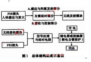 從圖l可知,系統(tǒng)分成了兩個彼此獨立的部分,即感應(yīng)人體信號、經(jīng)處理后實現(xiàn)信號的間隔發(fā)射部分,和接收處理后與插座連接的部分。其中感應(yīng)與間歇發(fā)射部分,可設(shè)計制作成一個小巧、且具有一定藝術(shù)造型的裝飾品,放置于室內(nèi)人員相對固定的場所旁邊,如辦公桌、飲水機、空調(diào)等處??紤]到人體紅外感應(yīng)接收人體信號的范圍和方向性,系統(tǒng)應(yīng)用了 雙PIR探頭,同時運用了無線收發(fā)射技術(shù)。
