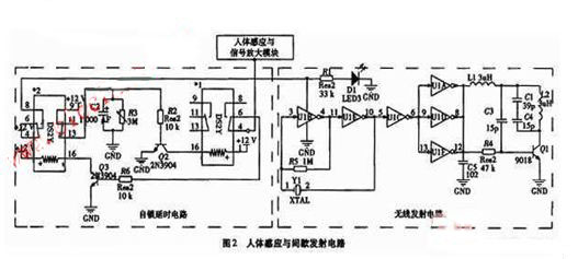 無線發(fā)射電路:電路由左邊延時部分觸發(fā)接通。電路由CD4069六反相器中的A、B、電阻R5、晶振組成高頻振蕩器,C、D、E、F分別組成整形及驅(qū)動電路,信號經(jīng)三極管9018放大,再經(jīng)L2、C1、C4諧振后向空中發(fā)射。