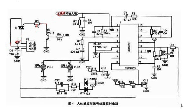 電路主要包括了電源電路、人體熱釋電紅外線傳感器、信號處理芯片、控制及執(zhí)行電路等部分。電源電路通過阻容(R15和C12)降壓,并經(jīng)過D1、D2整流,將220 V交流電轉(zhuǎn)換成可供芯片及外圍電路工作的低壓直流電(4.0 V~5.5 V)。CSC9803芯片工作電壓為直流4.O V~5.5 V,內(nèi)置穩(wěn)壓3.1 V輸出直接驅(qū)動PIR管。人體紅外釋熱傳感器PIR探頭感應(yīng)到信號經(jīng)CSC9803芯片內(nèi)部放大,若判斷有觸發(fā),運放輸出高電平,防止誤觸發(fā)??刂菩盘栍?/span> 芯片的11腳輸出,經(jīng)三極管放大控制雙向可控硅導(dǎo)通,從而控制外部交流接觸器或繼電器電磁線圈持續(xù)接通。