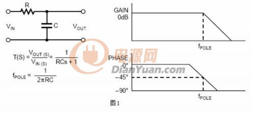 數(shù)學(xué)上,在傳輸方程式中,當(dāng)分母為零時會產(chǎn)生一個極點(diǎn)。在圖形上,當(dāng)增益以20dB每十倍頻的斜率開始遞減時,在博得圖上會產(chǎn)生一個極點(diǎn)。圖1舉例說明一個低通濾波器通常在系統(tǒng)中產(chǎn)生一個極點(diǎn)。其傳輸函數(shù)和博得圖也一并給出。