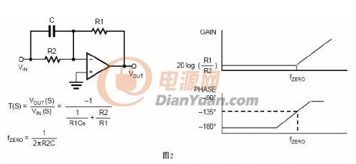 零點(diǎn)是頻域范圍內(nèi)的傳輸函數(shù)當(dāng)分子等于零時產(chǎn)生的。在博得圖中,零點(diǎn)發(fā)生在增益以20dB每十倍頻的斜率開始遞增的點(diǎn),并伴隨有90度的相位超前。圖2描述一個由高通濾波器電路引起的零點(diǎn)。