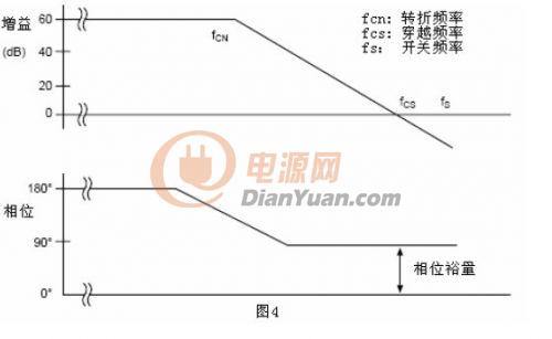 增益帶寬是指單位增益時的頻率,見圖4,增益帶寬就是穿越頻率Fcs。最大穿越頻率的主要限制因素是電源的開關(guān)頻率。根據(jù)采樣定理,如果采樣頻率小于2倍信號頻率(更嚴(yán)謹(jǐn)一點(diǎn)的說法是應(yīng)該小于2倍最大信號頻率,譯注),則被采樣的信息就不能被完全讀取。