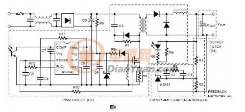 用經(jīng)典環(huán)路控制分析方法,開關(guān)調(diào)整器的控制環(huán)分為四個主要部分:輸出濾波器,PWM電路,誤差放大器補(bǔ)償和反饋。圖5用方塊圖舉例說明這四部分,圖6舉例說明一個開關(guān)電源電路圖。